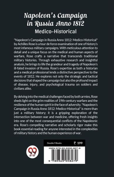 "Napoleon's Campaign in Russia Anno 1812: Medico-Historical" by Achilles Rose is a tour de force examination of one of history's most infamous military campaigns. With meticulous attention to detail and a unique focus on the medical and human aspects of warfare, Rose crafts a narrative that transcends traditional military histories. Through exhaustive research and insightful analysis, he brings to life the grandeur and tragedy of Napoleon's ill-fated invasion of Russia. Rose's expertise as both a historian and a medical professional lends a distinctive perspective to the events of 1812. He explores not only the strategic and tactical decisions that shaped the campaign but also the profound impact of disease, injury, and psychological trauma on soldiers and civilians alike. By delving into the medical challenges faced by both armies, Rose sheds light on the grim realities of 19th-century warfare and the resilience of the human spirit in the face of adversity. "Napoleon's Campaign in Russia Anno 1812: Medico-Historical" is more than just a military history; it is a gripping exploration of the intersection between war and medicine, offering fresh insights into one of the most consequential conflicts of the Napoleonic era. Rose's compelling narrative and scholarly rigor make this book essential reading for anyone interested in the complexities of military history and the human experience of war.