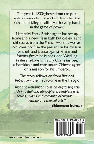 The year is 1833: ghosts from the past walk as reminders of wicked deeds but the rich and privileged still have the whip hand in the game of power. Nathaniel Parry, British agent, has set up home and a new life in Bath but old evils and old scores from the French Wars, as well as old loves, confuse the present. In his mission for truth and justice against villains and femmes fatales he is not alone. Working in the shadows is his ally, Cornelius Lee, a formidable and charismatic Chinese agent on a mission for his Emperor. The story follows on from Riot and Retribution, the first volume in the Trilogy.