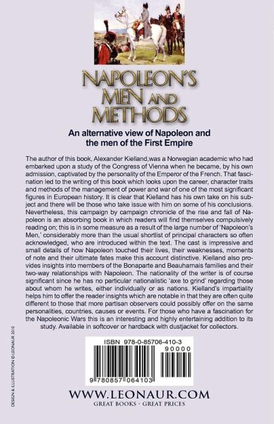 An alternative view of Napoleon and the men of the First Empire The author of this book, Alexander Kielland,was a Norwegian academic who had embarked upon a study of the Congress of Vienna when he became, by his own admission, captivated by the personality of the Emperor of the French. That fascination led to the writing of this book which looks upon the career, character traits and methods of the management of power and war of one of the most significant figures in European history. It is clear that Kielland has his own take on his subject and there will be those who take issue with him on some of his conclusions. Nevertheless, this campaign by campaign chronicle of the rise and fall of Napoleon is an absorbing book in which readers will find themselves compulsively reading on; this is in some measure as a result of the large number of 'Napoleon's Men,' considerably more than the usual shortlist of principal characters so often acknowledged, who are introduced within the text. The cast is impressive and small details of how Napoleon touched their lives, their weaknesses, moments of note and their ultimate fates make this account distinctive. Kielland also provides insights into members of the Bonaparte and Beauharnais families and their two-way relationships with Napoleon. The nationality of the writer is of course significant since he has no particular nationalistic 'axe to grind' regarding those about whom he writes, either individually or as nations. Kielland's impartiality helps him to offer the reader insights which are notable in that they are often quite different to those that more partisan observers could possibly offer on the same personalities, countries, causes or events. For those who have a fascination for the Napoleonic Wars this is an interesting and highly entertaining addition to its study. Available in softcover or hardback with dustjacket for collectors.