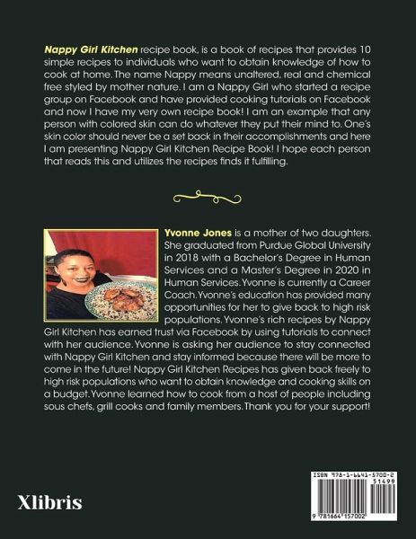 Nappy Girl Kitchen recipe book, is a book of recipes that provides 10 simple recipes to individuals who want to obtain knowledge of how to cook at home. The name Nappy means unaltered, real and chemical free styled by mother nature. I am a Nappy Girl who started a recipe group on Facebook and have provided cooking tutorials on Facebook and now I have my very own recipe book! I am an example that any person with colored skin can do whatever they put their mind to. One's skin color should never be a set back in their accomplishments and here I am presenting Nappy Girl Kitchen Recipe Book! I hope each person that reads this and utilizes the recipes finds it fulfilling.