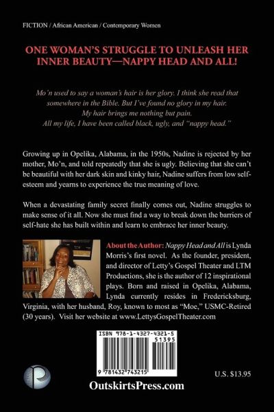 Mo'n used to say a woman's hair is her glory. I think she read that somewhere in the Bible. But I've found no glory in my hair. My hair brings me nothing but pain. All my life, I have been called black, ugly, and "nappy head." Growing up in Opelika, Alabama, in the 1950s, Nadine is rejected by her mother, Mo'n, and told repeatedly that she is ugly. Believing that she can't be beautiful with her dark skin and kinky hair, Nadine suffers from low self-esteem and yearns to experience the true meaning of love. When a devastating family secret finally comes out, Nadine struggles to make sense of it all. Now she must find a way to break down the barriers of self-hate she has built within and learn to embrace her inner beauty.