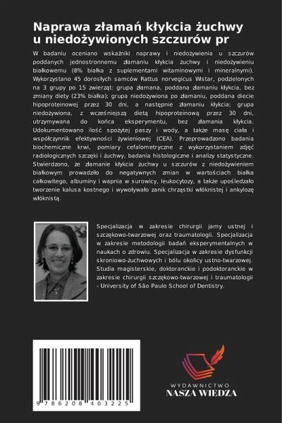 W badaniu oceniano wskäniki naprawy i niedo¿ywienia u szczurów poddanych jednostronnemu z¿amaniu k¿ykcia ¿uchwy i niedo¿ywieniu biäkowemu (8% biäka z suplementami witaminowymi i mineralnymi). Wykorzystano 45 doros¿ych samców Rattus norvegicus Wistar, podzielonych na 3 grupy po 15 zwierz¿t: grupa z¿amana, poddana z¿amaniu k¿ykcia, bez zmiany diety (23% biäka); grupa niedo¿ywiona po z¿amaniu, poddana diecie hipoproteinowej przez 30 dni, a nast¿pnie z¿amaniu k¿ykcia; grupa niedo¿ywiona, z wcze¿niejsz¿ diet¿ hipoproteinow¿ przez 30 dni, utrzymywana do ko¿ca eksperymentu, bez z¿amania k¿ykcia. Udokumentowano ilo¿¿ spo¿ytej paszy i wody, a tak¿e mas¿ ciäa i wspó¿czynnik efektywno¿ci ¿ywieniowej (CEA). Przeprowadzono badania biochemiczne krwi, pomiary cefalometryczne z wykorzystaniem zdj¿¿ radiologicznych szcz¿ki i ¿uchwy, badania histologiczne i analizy statystyczne. Stwierdzono, ¿e z¿amanie k¿ykcia ¿uchwy u szczurów z niedo¿ywieniem biäkowym prowadzi¿o do negatywnych zmian w warto¿ciach biäka cäkowitego, albuminy i wapnia w surowicy, leukocytozy, a tak¿e upo¿ledzäo tworzenie kalusa kostnego i wywo¿ywäo zanik chrz¿stki w¿óknistej i ankyloz¿ w¿óknist¿.