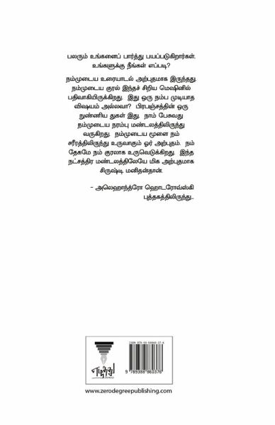 பலரும் உங்களைப் பார்த்து பயப்படுகிறார்கள். உங்களுக்கு நீங்கள் எப்படி? நம்முடைய உரையாடல் அற்புதமாக இருந்தது. நம்முடைய குரல் இந்தச் சிறிய மெஷினில் பதிவாகியிருக்கிறது. இது ஒரு நம்ப முடியாத விஷயம் அல்லவா? பிரபஞ்சத்தின் ஒரு நுண்ணிய துகள் இது. நாம் பேசுவது நம்முடைய நரம்பு மண்டலத்திலிருந்து வருகிறது. நம்முடைய மூளை நம் சரீரத்திலிருந்து உருவாகும் ஓர் அற்புதம். நம் தேகமே நம் குரலாக உருவெடுக்கிறது. இந்த நட்சத்திர மண்டலத்திலேயே மிக அற்புதமாக சிருஷ்டி மனிதன்தான். - அலெஹாந்த்ரோ ஹொடரோவ்ஸ்கி புத்தகத்திலிருந்து...