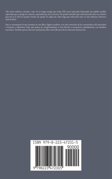 "Me siento enferma, cansada y vieja. Ya no tengo energía para nada. Sólo estoy esperando. Esperando una palabra amable, esperando que se ponga en contacto, esperando que me reconozca. No puedo entender qué estoy haciendo mal, no es bueno para mí, lo sé. Pero no puedo evitarlo, me quedo. Es culpa mía. Sólo tengo que esforzarme más, ser más tolerante. Entonces todo irá bien". Esto es exactamente lo que tratamos en este libro. Quiero ayudarte a ser más consciente de las características del narcisismo e invitarte a reflexionar sobre qué pautas de comportamiento te han llevado a encontrarte repetidamente con hombres narcisistas. También quiero ofrecerte orientación sobre cómo liberarte de las relaciones destructivas.