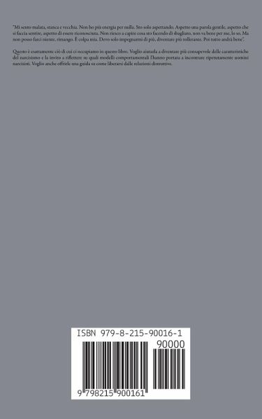 "Mi sento malata, stanca e vecchia. Non ho più energia per nulla. Sto solo aspettando. Aspetto una parola gentile, aspetto che si faccia sentire, aspetto di essere riconosciuta. Non riesco a capire cosa sto facendo di sbagliato, non va bene per me, lo so. Ma non posso farci niente, rimango. È colpa mia. Devo solo impegnarmi di più, diventare più tollerante. Poi tutto andrà bene". Questo è esattamente ciò di cui ci occupiamo in questo libro. Voglio aiutarla a diventare più consapevole delle caratteristiche del narcisismo e la invito a riflettere su quali modelli comportamentali l'hanno portata a incontrare ripetutamente uomini narcisisti. Voglio anche offrirle una guida su come liberarsi dalle relazioni distruttive.