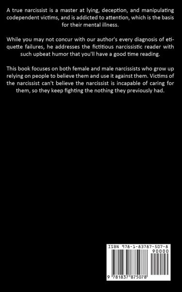 A true narcissist is a master at lying, deception, and manipulating codependent victims, and is addicted to attention, which is the basis for their mental illness. While you may not concur with our author's every diagnosis of etiquette failures, he addresses the fictitious narcissistic reader with such upbeat humor that you'll have a good time reading. This book focuses on both female and male narcissists who grow up relying on people to believe them and use it against them. Victims of the narcissist can't believe the narcissist is incapable of caring for them, so they keep fighting the nothing they previously had.