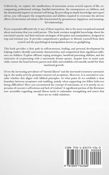 Collectively, we explore the ramifications of narcissism across several aspects of life, encompassing professional settings, familial interactions, the consequences on children, and the detrimental impacts on mental well-being. By providing in-depth knowledge and expert advice, you will acquire the comprehension and abilities required to overcome the adverse effects of narcissism and adopt a life characterized by genuineness, happiness, and meaningful relationships. If you responded affirmatively to any of these inquiries, this is the most exceptional manual about narcissism that you could peruse. This book contains insightful knowledge about the narcissist's psyche and their intricate strategies of deception and manipulation, designed to trap and torment you. It provides comprehensive guidance to liberate yourself from their control and the psychological manipulation known as gaslighting. This book provides a clear path to self-awareness, healing, and personal development by helping readers identify narcissistic characteristics and comprehend their significant influence on children. Explore efficient coping strategies, beneficial parenting abilities, and the intricacies of co-parenting with a narcissistic former spouse. Acquire how to assist your child, restore the bond between parent and child, and establish a favourable model for their emotional growth. Given the increasing prevalence of "mental illness" and the increased awareness surrounding it, the media actively promotes unreserved acceptance. However, it is essential to consider whether this aligns with biblical principles. At what point do we establish a clear boundary between acceptance and enabling, mainly when supporting our fellow believers facing difficulties? Have you encountered the concept of narcissism, or is it merely an expression of excessive self-esteem and lack of wisdom? A significant portion of the literature now accessible regarding mental illness tends to rationalise wrongdoing and assert that there are no viable solutions.