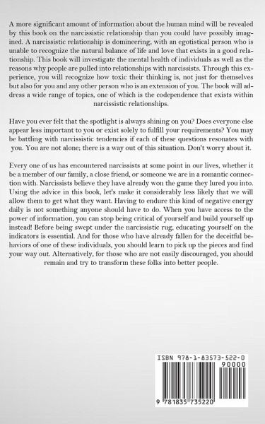 A more significant amount of information about the human mind will be revealed by this book on the narcissistic relationship than you could have possibly imagined. A narcissistic relationship is domineering, with an egotistical person who is unable to recognize the natural balance of life and love that exists in a good relationship. This book will investigate the mental health of individuals as well as the reasons why people are pulled into relationships with narcissists. Through this experience, you will recognize how toxic their thinking is, not just for themselves but also for you and any other person who is an extension of you. The book will address a wide range of topics, one of which is the codependence that exists within narcissistic relationships. Have you ever felt that the spotlight is always shining on you? Does everyone else appear less important to you or exist solely to fulfill your requirements? You may be battling with narcissistic tendencies if each of these questions resonates with you. You are not alone; there is a way out of this situation. Don't worry about it. Every one of us has encountered narcissists at some point in our lives, whether it be a member of our family, a close friend, or someone we are in a romantic connection with. Narcissists believe they have already won the game they lured you into. Using the advice in this book, let's make it considerably less likely that we will allow them to get what they want. Having to endure this kind of negative energy daily is not something anyone should have to do. When you have access to the power of information, you can stop being critical of yourself and build yourself up instead! Before being swept under the narcissistic rug, educating yourself on the indicators is essential. And for those who have already fallen for the deceitful behaviors of one of these individuals, you should learn to pick up the pieces and find your way out. Alternatively, for those who are not easily discouraged, you should remain and try to transform these folks into better people.