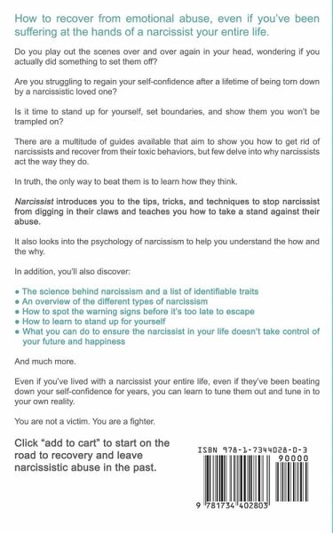 Narcissist introduces you to the tips, tricks, and techniques to stop narcissist from digging in their claws and teaches you how to take a stand against their abuse. It also looks into the psychology of narcissism to help you understand the how and the why. In addition, you’ll also discover: The science behind narcissism and a list of identifiable traits An overview of the different types of narcissism How to spot the warning signs before it’s too late to escape How to learn to stand up for yourself What you can do to ensure the narcissist in your life doesn’t take control of your future and happiness And much more. Even if you’ve lived with a narcissist your entire life, even if they’ve been beating down your self-confidence for years, you can learn to tune them out and tune in to your own reality. You are not a victim. You are a fighter.