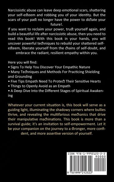 Narcissistic abuse can leave deep emotional scars, shattering your self-esteem and robbing you of your identity. But the scars of your past no longer have the power to dictate your future!. If you want to reclaim your power, trust yourself again, and build a beautiful life after narcissistic abuse, then you need to read this book! With this book in your hands, you will uncover powerful techniques to rebuild your shattered self-esteem, liberate yourself from the chains of self-doubt, and embrace the radiant, resilient empathy within you. Here you will find:Signs To Help You Discover Your Empathic Nature Many Techniques and Methods For Practicing Shielding and Grounding Five Tips Empath Need To Protect Their Sensitive Hearts Things to Openly Avoid as an Empath A Deep Dive Into the Different Stages of Spiritual Awakening Whatever your current situation is, this book will serve as a guiding light, illuminating the shadowy corners where bullies thrive, and revealing the multifarious mechanics that drive their manipulative machinations. This book is more than a survival guide; it's an invitation to self-empowerment. Let it be your companion on the journey to a stronger, more confident, and more assertive version of yourself.
