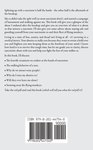 Splitting up with a narcissist is half the battle - the other half is the aftermath of the breakup. My ex didn't take the split well (as most narcissists don't), and started a campaign of harassment and stalking against me. This book will give you a glimpse of the abuse I endured after the breakup and give you an overview of what it is about us that attracts a narcissist. I'll also give you some advice about staying safe and guarding yourself from your narcissistic ex and their fleet of flying monkeys. Living in a state of fear, anxiety and dread isn't living at all - it's surviving in a world of misery. Your abusive ex stalks you because they want to retain a hold over you and frighten you into keeping them at the forefront of your mind. I know how hard it is to survive this tough time, but let me guide you to clarity, discuss narcissistic abuse with you and help you fight the fear of your stalker ex. In this book, I'll discuss: • The horrific treatment we endure at the hands of narcissists. • The stalking behavior of a narc. • Why do we attract toxic people? • Why do I miss my abusive ex? • Will they ever leave me alone? • Swatting away the flying monkeys. Take the red pill and read this book (which will tell you what the red pill is!)