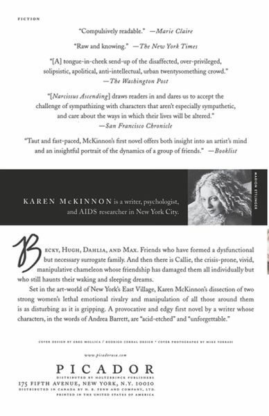 Becky, Hugh, Dahlia, and Max. Friends who have formed a dysfunctional but necessary surrogate family. Callie, the crisis-prone, vivid, manipulative chameleon whose friendship has damaged them all individually but who still haunts their waking and sleeping dreams. Becky, orphan, survivor, caffeine addict, on the verge of 30 and hoping to become famous with her first solo show of dismemberment collages in New York's East Village. Hugh, now a CPA in California, once the most sophisticated undergrad and object of Becky's frustrated desire and rivalry with Callie. Max, all leather, brooding and disguise, the actor who Callie left Hugh for, and who also had an affair with big-hearted, victimized dancer, Dahlia. For as long as they have known each other their common language has been Callie-past tense. When Dahlia plots a revenge drama to be staged at Becky's gallery opening, she unwittingly revives their nostalgia for the outcast Callie's seductive charm and sets in motion a plan that forces Becky and Callie to play out their lethal emotional rivalry to the end. Told from the point of view of Becky, Narcissus Ascending is an unputdownable debut. Karen McKinnon's dissection of friendship, and the manipulative rivalry of two strong women is provocative and disturbing.