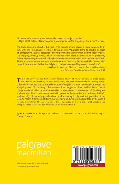 This book provides the first comprehensive study of narco cinema, a cross-border exploitation cinema that, for over forty years, has been instrumental in shaping narco-culture in Mexico and the US borderlands. Identifying classics in its mammoth catalogue and analyzing select films at length, Rashotte outlines the genre's history and aesthetic criteria. He approaches its history as an alternative to mainstream representation of the drug war and considers how its vernacular aesthetic speaks to the anxieties and desires of Latina/o audiences by celebrating regional cultures while exploring the dynamics of global transition. Despite recent federal prohibitions, narco cinema endures as a popular folk art because it reflects distinctively the experiences of those uprooted by the forces of globalization and critiques those forces in ways mainstream cinema has failed.