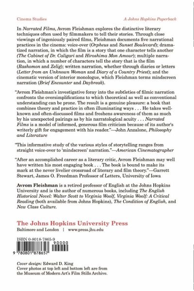 In "Narrated Films," Avrom Fleishman explores the distinctive literary techniques often used by filmmakers to tell their stories. Through close viewings of ingeniously paired films, Fleishman documents five narrational practices in the cinema: voice-over ( "Orpheus" and "Sunset Boulevard"); dramatized narration, in which the film is a story that one character tells another ( "The Cabinet of Dr. Caligari" and "Hiroshima Mon Amour"); multiple narration, in which a number of characters tell the story that is the film ( "Rashomon" and "Zelig"); written narration, whether through diaries or letters ( "Letter from an Unknown Woman" and "Diary of a Country Priest"); and the cinematic version of interior monologue, which Fleishman terms "mindscreen narration" ( "Brief Encounter" and "Daybreak").