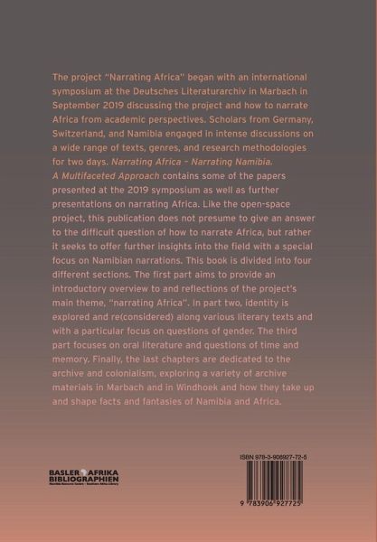 The project "Narrating Africa" began with an international symposium at the Deutsches Literaturarchiv in Marbach in September 2019 discussing the project and how to narrate Africa from academic perspectives. Scholars from Germany, Switzerland, and Namibia engaged in intense discussions on a wide range of texts, genres, and research methodologies for two days. This book contains some of the papers presented at the 2019 symposium as well as further presentations on narrating Africa. Like the open-space project, this publication does not presume to give an answer to the difficult question of how to narrate Africa, but rather it seeks to offer further insights into the field with a special focus on Namibian narrations. This book is divided into four different sections. The first part aims to provide an introductory overview to and reflections of the project's main theme, "narrating Africa". In part two, identity is explored and re(considered) along various literary texts and with a particular focus on questions of gender. The third part focuses on oral literature and questions of time and memory. Finally, the last chapters are dedicated to the archive and colonialism, exploring a variety of archive materials in Marbach and in Windhoek and how they take up and shape facts and fantasies of Namibia and Africa.