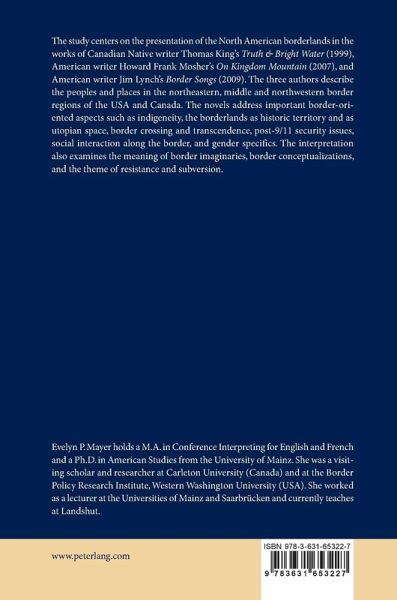 The study centers on the presentation of the North American borderlands in the works of Canadian Native writer Thomas King's Truth & Bright Water (1999), American writer Howard Frank Mosher's On Kingdom Mountain (2007), and American writer Jim Lynch's Border Songs (2009). The three authors describe the peoples and places in the northeastern, middle and northwestern border regions of the USA and Canada. The novels address important border-oriented aspects such as indigeneity, the borderlands as historic territory and as utopian space, border crossing and transcendence, post-9/11 security issues, social interaction along the border, and gender specifics. The interpretation also examines the meaning of border imaginaries, border conceptualizations, and the theme of resistance and subversion.