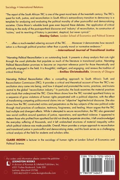 Narrating Political Reconciliation advances a distinctive discourse analysis of South Africa's reconciliation process by enquiring into the politics of the following: writing national history, confessional, and testimonial styles of truth, and reconciliation as theology and therapy. Moon argues that the TRC was the catalyst for, and shaped the parameters of, what is now powerful 'reconciliation industry,' and her insights provide a theoretical framework through which to think and problematise the politics of transitional justice in post-conflict and democratizing states more generally.