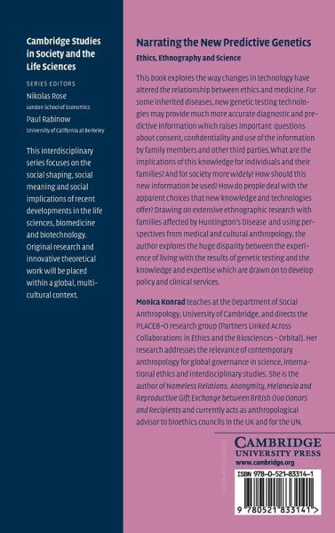 This work explores the way changes in technology have affected the relationship between ethics and medicine, generating new approaches to ethical issues and the implications of medical practice. Drawing on extensive ethnographic research with families affected by Huntington's Disease, Monica Konrad explores the huge disparity between the experience of living with the results of genetic testing and the knowledge and expertise to develop policy, clinical services and support.