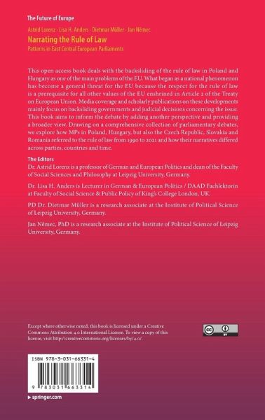 This open access book deals with the backsliding of the rule of law in Poland and Hungary as one of the main problems of the EU. What began as a national phenomenon has become a general threat for the EU because the respect for the rule of law is a prerequisite for all other values of the EU enshrined in Article 2 of the Treaty on European Union. Media coverage and scholarly publications on these developments mainly focus on backsliding governments and judicial decisions concerning the issue. This book aims to inform the debate by adding another perspective and providing a broader view. Drawing on a comprehensive collection of parliamentary debates, we explore how MPs in Poland, Hungary, but also the Czech Republic, Slovakia and Romania referred to the rule of law from 1990 to 2021 and how their narratives differed across parties, countries and time.
