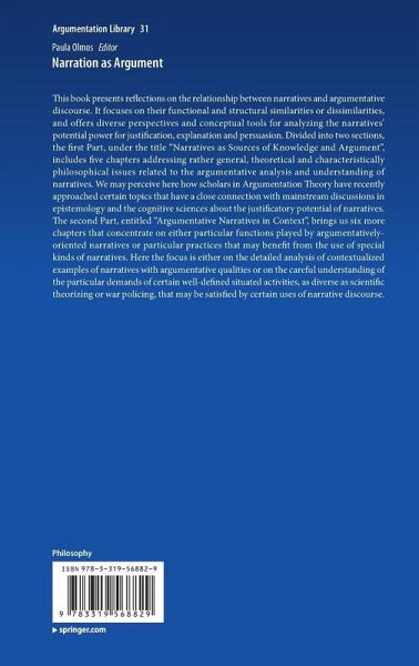 Chapter 1. Introduction: Narratives, Narrating, Narrators; Paula Olmos.- Part I Narratives as Sources of Knowledge and Argument.- Chapter 2. Narratives and the Concept of Argument; Christopher Tindale.- Chapter 3. Arguing with Stories; Floris Bex and Trevor Bench-Capon.- Chapter 4. Narrative Fiction as a Source of Knowledge; Mitchell Green.- Chapter 5. Analogy, Presupposition and Transcendentality in Narrative Argument; Gilbert Plumer.- Chapter 6. Parables: Crossroads Between the Cognitive Theory of Metaphor and Argumentation Theory; Eduardo de Bustos.- Part II Argumentative Narratives in Context.- Chapter 7. Narratives and Pragmatic Arguments: Iven's The 400 million; Paul van den Hoven.- Chapter 8. The Sample Convention, or, When Fictionalized Narratives. Can Double as Historical Testimony; Leona Toker.- Chapter 9. From Narrative Arguments to Arguments that Narrate; Adrien Frenay and Marion Carel.- Chapter 10. Narrative as Argument in Atul Gawande's. "OnWashing Hands" and "Letting Go"; James Phelan.- Chapter 11. On Thought Experiments and other Narratives in Scientific Argument; Paula Olmos.- Chapter 12. How to Win Wars: The Role of the War Narrative; Tone Kvernbekk and Ola Bøe-Hansen.