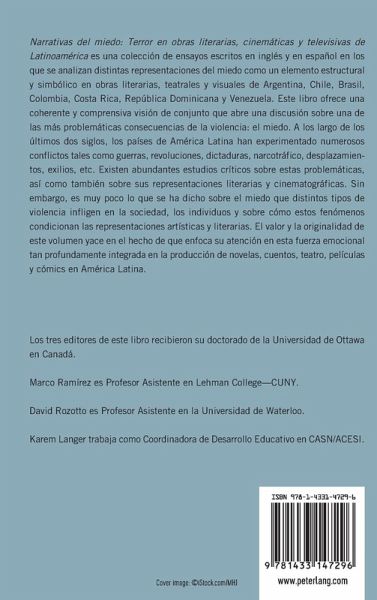 Narrativas del miedo: Terror en obras literarias, cinemáticas y televisivas de Latinoamérica es una colección de ensayos escritos en inglés y en español en los que se analizan distintas representaciones del miedo como un elemento estructural y simbólico en obras literarias, teatrales y visuales de Argentina, Chile, Brasil, Colombia, Costa Rica, República Dominicana y Venezuela. Este libro ofrece una coherente y comprensiva visión de conjunto que abre una discusión sobre una de las más problemáticas consecuencias de la violencia: el miedo. A los largo de los últimos dos siglos, los países de América Latina han experimentado numerosos conflictos tales como guerras, revoluciones, dictaduras, narcotráfico, desplazamientos, exilios, etc. Existen abundantes estudios críticos sobre estas problemáticas, así como también sobre sus representaciones literarias y cinematográficas. Sin embargo, es muy poco lo que se ha dicho sobre el miedo que distintos tipos de violencia infligen en la sociedad, los individuos y sobre cómo estos fenómenos condicionan las representaciones artísticas y literarias. El valor y la originalidad de este volumen yace en el hecho de que enfoca su atención en esta fuerza emocional tan profundamente integrada en la producción de novelas, cuentos, teatro, películas y cómics en América Latina.