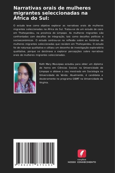 O estudo teve como objetivo explorar as narrativas orais de mulheres migrantes seleccionadas na África do Sul. Tratou-se de um estudo de caso em Thohoyandou, na província do Limpopo. As mulheres migrantes são confrontadas com desafios de integração, tais como desafios políticos e socioeconómicos. O estudo centrou-se na reflexão sobre as histórias de mulheres migrantes seleccionadas que residem em Thohoyandou. O estudo foi de natureza qualitativa e utilizou um desenho de investigação exploratória qualitativa, porque se destinava a explorar percepções sobre narrativas orais de mulheres migrantes seleccionadas.