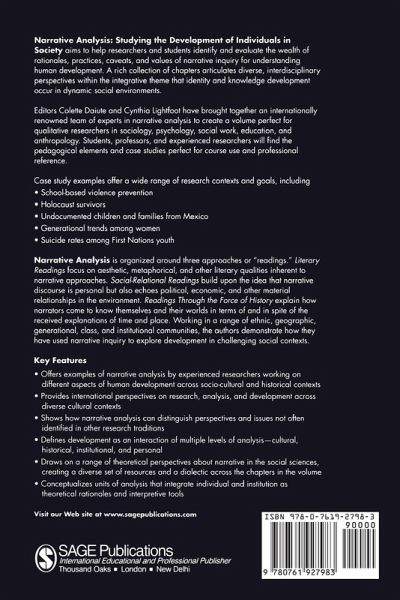Narrative Analysis: Studying the Development of Individuals in Society aims to help researchers and students identify and evaluate the wealth of rationales, practices, caveats, and values of narrative inquiry for understanding human development. A rich collection of chapters articulates diverse, interdisciplinary perspectives within the integrative theme that identity and knowledge development occur in dynamic social environments. Editors Colette Daiute and Cynthia Lightfoot have brought together an internationally renowned team of experts in narrative analysis to create a volume perfect for qualitative researchers in sociology, psychology, social work, education, and anthropology. Students, professors, and experienced researchers will find the pedagogical elements and case studies perfect for course use and professional reference.