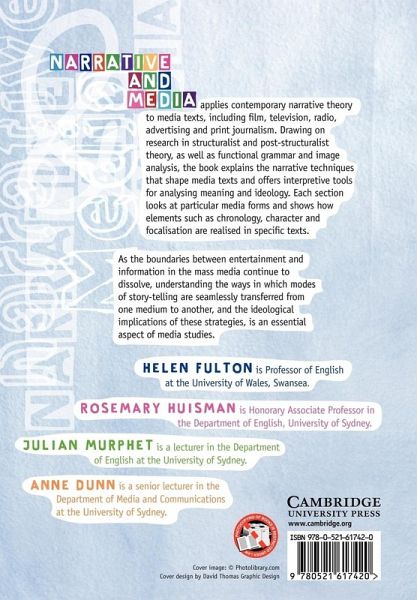 Figures and tables; List of contributors; Acknowledgements; 1. Introduction: the power of narrative Helen Fulton; Part I. The Basics of Narrative Theory: 2. Narrative concepts Rosemary Huisman; 3. From structuralism to post-structuralism Rosemary Huisman; Part II. Film as Narrative and Visual Mode: 4. Stories and plots Julian Murphet; 5. Narrative time Julian Murphet; 6. Narrative voice Julian Murphet; 7. Point of view Julian Murphet; 8. Novel to film Helen Fulton; 9. Film narrative and visual cohesion Helen Fulton; Part III. Television: Narratives and Ideology: 10. The genres of television Anne Dunn; 11. Television news as narrative Anne Dunn; 12. Aspects of narrative in series and serials Rosemary Huisman; 13. Soap-operas and sit-coms Rosemary Huisman; Part IV. Radio and Print Journalism: 14. Structures of radio drama Anne Dunn; 15. Radio news and interviews Anne Dunn; 16. Print news as narrative Helen Fulton; 17. Analysing the discourse of news Helen Fulton; Part V. Popular Print Culture: 18. Magazine genres Rosemary Huisman; 19. Advertising narratives Rosemary Huisman; 20. Conclusion: postmodern narrative and media Helen Fulton; Glossary; Bibliography; Index.