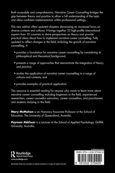 This new edition offers updated chapters showcasing an increased focus on diverse contexts and cultures. It brings together 33 high-profile international experts from 10 countries to share perspectives on theory and provide practical ideas about how to implement narrative career counselling. Fully updated to reflect changes in the field, including the growth of narrative counselling, it: provides a foundation for narrative career counselling by considering its philosophical and theoretical background;presents a range of approaches that demonstrate the integration of theory and practice;studies the application of narrative career counselling in a range of cultures and contexts; andprovides examples of practical application.