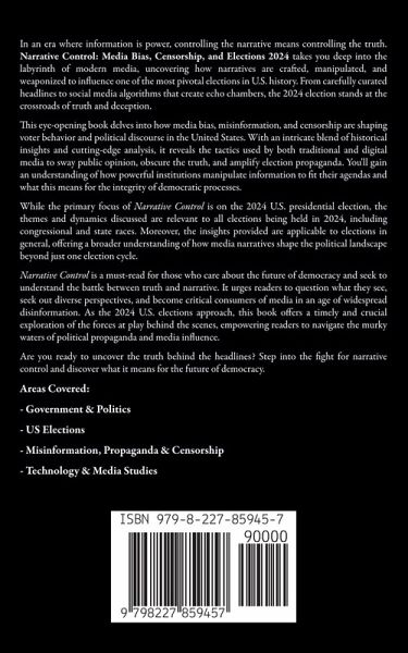 In an era where information is power, controlling the narrative means controlling the truth. Narrative Control: Media Bias, Censorship, and Elections 2024 takes you deep into the labyrinth of modern media, uncovering how narratives are crafted, manipulated, and weaponized to influence one of the most pivotal elections in U.S. history. From carefully curated headlines to social media algorithms that create echo chambers, the 2024 election stands at the crossroads of truth and deception. This eye-opening book delves into how media bias, misinformation, and censorship are shaping voter behavior and political discourse in the United States. With an intricate blend of historical insights and cutting-edge analysis, it reveals the tactics used by both traditional and digital media to sway public opinion, obscure the truth, and amplify election propaganda. You'll gain an understanding of how powerful institutions manipulate information to fit their agendas and what this means for the integrity of democratic processes. While the primary focus of Narrative Control is on the 2024 U.S. presidential election, the themes and dynamics discussed are relevant to all elections being held in 2024, including congressional and state races. Moreover, the insights provided are applicable to elections in general, offering a broader understanding of how media narratives shape the political landscape beyond just one election cycle. Narrative Control is a must-read for those who care about the future of democracy and seek to understand the battle between truth and narrative. It urges readers to question what they see, seek out diverse perspectives, and become critical consumers of media in an age of widespread disinformation. As the 2024 U.S. elections approach, this book offers a timely and crucial exploration of the forces at play behind the scenes, empowering readers to navigate the murky waters of political propaganda and media influence. Are you ready to uncover the truth behind the headlines? Step into the fight for narrative control and discover what it means for the future of democracy.