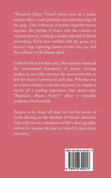 "Narrative Dance Verses" invites you on a poetic journey where words pirouette and emotions leap off the page. This collection of poems elegantly weaves together the rhythm of dance with the cadence of narrative poetry, creating a unique tapestry of lyrical storytelling. Each verse unfolds with the grace of a dancer's step, exploring themes of love, loss, joy, and the resilience of the human spirit.Crafted with meticulous care, these poems transcend the conventional boundaries of poetry, inviting readers to not only envision the movements but to feel the dancer's passion in each line. Whether you are a lover of dance, a devotee of poetry, or simply in search of a reading experience that moves you, "Narrative Dance Verses" offers a beautiful synthesis of both worlds.Prepare to be swept off your feet by the power of words dancing to the rhythms of human emotions. This collection is a celebration of life's choreography, written for anyone who has ever dared to dance their own story. Copyright (c) 2024 Swan Charm Publishing