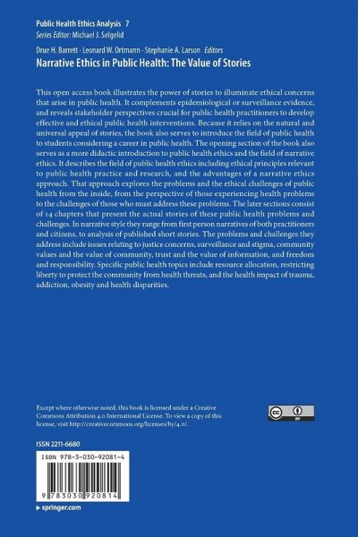 This Open Access book illustrates the power of stories to illuminate ethical concerns that arise in public health. It complements epidemiological or surveillance evidence, and reveals stakeholder perspectives crucial for public health practitioners to develop effective and ethical public health interventions. Because it relies on the natural and universal appeal of stories, the book also serves to introduce the field of public health to students considering a career in public health. The opening section of the book also serves as a more didactic introduction to public health ethics and the field of narrative ethics. It describes the field of public health ethics including ethical principles relevant to public health practice and research, and the advantages of a narrative ethics approach. That approach explores the problems and the ethical challenges of public health from the inside, from the perspective of those experiencing health problems to the challenges of those who must address these problems. The later sections consist of 14 chapters that present the actual stories of these public health problems and challenges. In narrative style they range from first person narratives of both practitioners and citizens, to analysis of published short stories. The problems and challenges they address include issues relating to justice concerns, surveillance and stigma, community values and the value of community, trust and the value of information, and freedom and responsibility. Specific public health topics include resource allocation, restricting liberty to protect the community from health threats, and the health impact of trauma, addiction, obesity and health disparities.