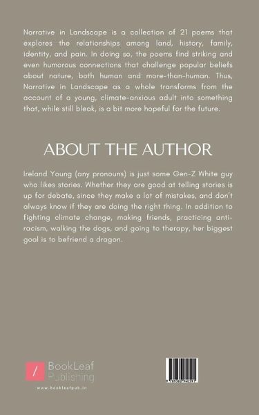 Narrative in Landscape is a collection of 21 poems that explores the relationships among land, history, family, identity, and pain. In doing so, the poems find striking and even humorous connections that challenge popular beliefs about nature, both human and more-than-human. Thus, Narrative in Landscape as a whole transforms from the account of a young, climate-anxious adult into something that, while still bleak, is a bit more hopeful for the future.