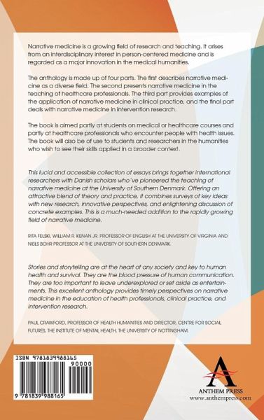 This anthology is the first of its kind which integrates chapters on legitimizing narrative medicine in education, practice and research, on analyzing types of patient narratives and on studying interventions applying vulnerable or shared reading, creative writing, or Socratic dialogue as a means of rehabilitation and mental care.