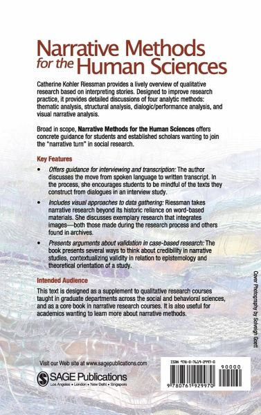 'Riessman updates, expands, and to some degree reconceptualizes her 1993 SAGE book, Narrative Analysis, which has probably been the most cited methodological source for narrative reserach. The new version deserves even greater success than its predecessor....The greatest virtue of Riessman's book, for my taste, is her refusal to reduce method to procedure' - Canadian Journal of Sociology Catherine Kohler Riessman provides a lively overview of qualitative research based on interpreting stories. Designed to improve research practice, it provides detailed discussions of four analytic methods: thematic analysis, structural analysis, dialogic/performance analysis, and visual narrative analysis. Broad in scope, Narrative Methods for the Human Sciences offers concrete guidance for students and established scholars wanting to join the "narrative turn" in social research. Key Features " Offers guidance for interviewing and transcription: The author discusses the move from spoken language to written transcript. In the process, she encourages students to be mindful of the texts they construct from dialogues in an interview study. " Includes visual approaches to data gathering: Riessman takes narrative research beyond its historic reliance on word-based materials. She discusses exemplary research that integrates images-both those made during the research process and others found in archives. " Presents arguments about validation in case-based research: The book presents several ways to think about credibility in narrative studies, contextualizing validity in relation to epistemology and theoretical orientation of a study. Intended Audience This text is designed as a supplement to qualitative research courses taught in graduate departments across the social and behavioral sciences, and as a core book in narrative research courses. It is also useful for academics wanting to learn more about narrative methods.