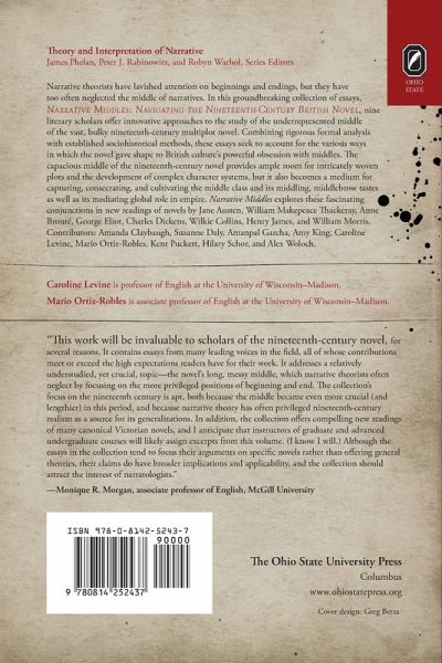 Narrative theorists have lavished attention on beginnings and endings, but they have too often neglected the middle of narratives. In this groundbreaking collection of essays, Narrative Middles: Navigating the Nineteenth-Century British Novel, nine literary scholars offer innovative approaches to the study of the underrepresented middle of the vast, bulky nineteenth-century multiplot novel. Combining rigorous formal analysis with established sociohistorical methods, these essays seek to account for the various ways in which the novel gave shape to British culture's powerful obsession with middles. The capacious middle of the nineteenth-century novel provides ample room for intricately woven plots and the development of complex character systems, but it also becomes a medium for capturing, consecrating, and cultivating the middle class and its middling, middlebrow tastes as well as its mediating global role in empire. Narrative Middles explores these fascinating conjunctions in new readings of novels by Jane Austen, William Makepeace Thackeray, Anne Brontë, George Eliot, Charles Dickens, Wilkie Collins, Henry James, and William Morris. Contributors: Amanda Claybaugh, Suzanne Daly, Amanpal Garcha, Amy King, Caroline Levine, Mario Ortiz-Robles, Kent Puckett, Hilary Schor, and Alex Woloch.