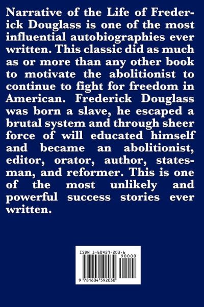 Narrative of the Life of Frederick Douglass is one of the most influential autobiographies ever written. This classic did as much as or more than any other book to motivate the abolitionist to continue to fight for freedom in American. Frederick Douglass was born a slave, he escaped a brutal system and through sheer force of will educated himself and became an abolitionist, editor, orator, author, statesman, and reformer. This is one of the most unlikely and powerful success stories ever written