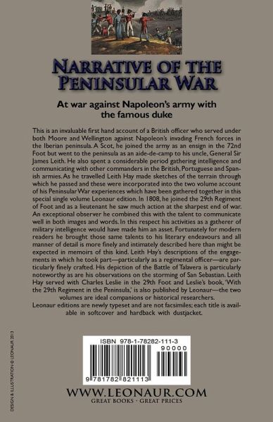 At war against Napoleon's army with the famous duke This is an invaluable first hand account of a British officer who served under both Moore and Wellington against Napoleon's invading French forces in the Iberian peninsula. A Scot, he joined the army as an ensign in the 72nd Foot and but went to the peninsula as an aide-de-camp to his uncle, General Sir James Leith. He also spent a considerable period gathering intelligence and communicating with other commanders in the British, Portuguese and Spanish armies. As he travelled Leith Hay made sketches of the terrain through which he passed and these were incorporated into the two volume account of his Peninsular War experiences which have been gathered together in this special single volume Leonaur edition. In 1808, he joined the 29th Regiment of Foot and as a lieutenant in he saw much action at the sharpest end of war. An exceptional observer he combined this with the talent to communicate well in both images and words. In this respect his activities as a gatherer of military intelligence would have made him an asset. Fortunately for modern readers he brought those same talents to his literary endeavours and all manner of detail is more finely and intimately described here than might be expected in memoirs of this kind. Leith Hay's descriptions of the engagements in which he took part-particularly as a regimental officer-are particularly finely crafted. His depiction of the Battle of Talavera is particularly noteworthy as are his observations on the storming of San Sebastian. Leith Hay served with Charles Leslie in the 29th Foot and Leslie's book, 'With the 29th Regiment in the Peninsula,' is also published by Leonaur-the two volumes are ideal companions for historical researchers. Leonaur editions are newly typeset and are not facsimiles; each title is available in softcover and hardback with dustjacket.