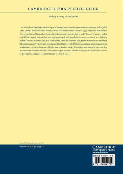 This two-volume English translation of part of a longer travel narrative by the Ottoman aristocrat Evilya Çelebi (1611-c.1680) was translated by the Austrian scholar Joseph von Hammer (1774-1856) and published in 1834 by the Oriental Translation Fund of Great Britain and Ireland, set up to make 'Eastern' texts more widely available in English. Çelebi was highly educated, had served the Ottoman court both as a diplomat and as a soldier, and as he says, had in his travels 'seen the countries of eighteen monarchs and heard 147 different languages'. His lifetime encompassed the highest point of Ottoman expansion into Europe, and his indefatigable curiosity about everything he saw makes this work a fascinating assemblage of topics varying from the fountains of Istanbul to a journey to Georgia. Volume 2 includes Çelebi's eye-witness account of the siege and conquest of Canea (Khania) in Crete in 1645.