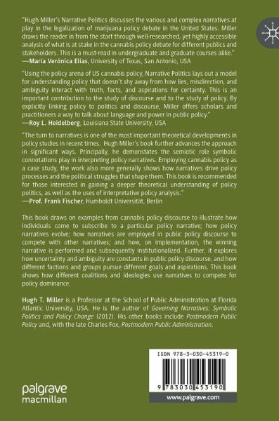 This book draws on examples from cannabis policy discourse and elsewhere to illustrate how individuals come to subscribe to a particular policy narrative; how policy narratives evolve; how narratives are employed in public policy discourse to compete with other narratives; and how, on implementation, the winning narrative is performed and subsequently institutionalized. Further, it explores how uncertainty and ambiguity are constants in public policy discourse, and how different factions and groups pursue different goals and aspirations. In the current climate of political reality, disputable facts and contestable goals, this book shows how different coalitions and ideologies use narratives to compete for policy dominance.
