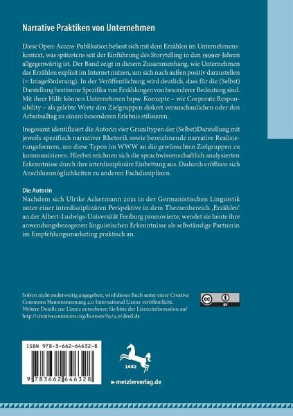 Diese Open-Access-Publikation befasst sich mit dem Erzählen im Unternehmenskontext, was spätestens seit der Einführung des Storytelling in den 1999er-Jahren allgegenwärtig ist. Der Band zeigt in diesem Zusammenhang, wie Unternehmen das Erzählen explizit im Internet nutzen, um sich nach außen positiv darzustellen (= Imageförderung). In der Veröffentlichung wird deutlich, dass für die (Selbst)Darstellung bestimme Spezifika von Erzählungen von besonderer Bedeutung sind. Mit ihrer Hilfe können Unternehmen bspw. Konzepte - wie Corporate Responsibility - als gelebte Werte den Zielgruppen diskret veranschaulichen oder den Arbeitsalltag zu einem besonderen Erlebnis stilisieren. Insgesamt identifiziert die Autorin vier Grundtypen der (Selbst)Darstellung mit jeweils spezifisch narrativer Rhetorik sowie bezeichnende narrative Realisierungsformen, um diese Typen im WWW an die gewünschten Zielgruppen zu kommunizieren. Hierbei zeichnen sich die sprachwissenschaftlich analysierten Erkenntnisse durch ihre interdisziplinäre Einbettung aus. Dadurch eröffnen sich Anschlussmöglichkeiten zu anderen Fachdisziplinen.