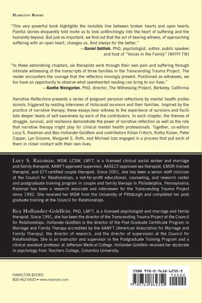 Narrative Reflections presents a series of poignant personal reflections by mental health professionals, triggered by reading interviews of Holocaust survivors and their families. Inspired by the practice of narrative therapy, these essays bear witness to the experience of survivors and facilitate deeper levels of self-awareness by each of the contributors. In each chapter, the themes of struggle, survival, and resilience demonstrate the power of narrative reflection as well as the role that narrative therapy might play for clinical mental health professionals. Together, co-editors Lucy S. Raizman and Bea Hollander-Goldfein and contributors Kilian Fritsch, Ruthy Kaiser, Peter Capper, Lyn Groome, Margaret S. Roth, and Michael Izzo engaged in a process that put each of them in closer contact with their own lives.