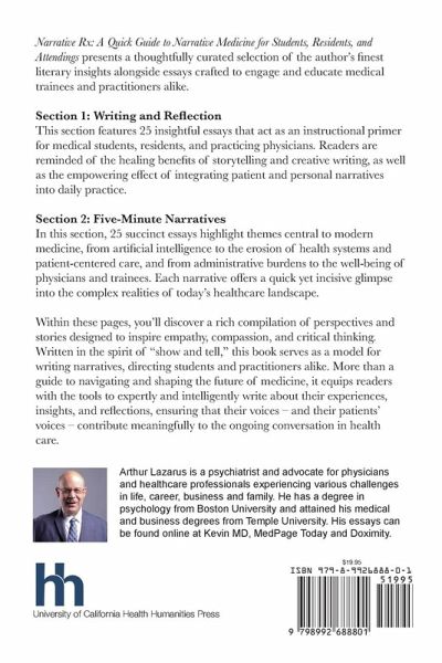 Narrative Rx: A Quick Guide to Narrative Medicine for Students, Residents, and Attendings presents a thoughtfully curated selection of the author's finest literary insights alongside essays crafted to engage and educate medical trainees and practitioners alike. Within these pages, you'll discover a rich compilation of perspectives and stories designed to inspire empathy, compassion, and critical thinking. Written in the spirit of "show and tell," this book serves as a model for writing narratives, directing students and practitioners alike. More than a guide to navigating and shaping the future of medicine, it equips readers with the tools to expertly and intelligently write about their experiences, insights, and reflections, ensuring that their voices - and their patients' voices - contribute meaningfully to the ongoing conversation in health care.