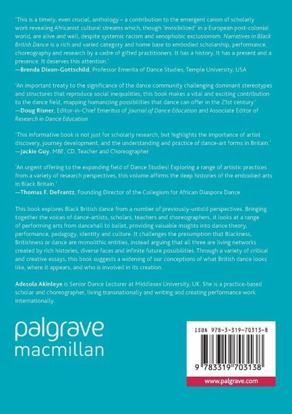 1. Narratives in Black British Dance - An Introduction.- 2. "I don't do Black-dance, I am a Black dancer"; Namron.- 3. Dance Britannia: the impact of global shifts on dance in Britain; Christy Adair and Ramsay Burt.- 4. Negotiating African Diasporic identity in Dance: Brown Bodies Creating and Existing in the British Dance Industry; Tia-Monique Uzor.- 5. Tracing the evolution of black representation in ballet and the impact on black British dancers today; Sandie Bourne.- 6. In-the-betweeness: Decolonising and re-inhabiting our dancing; Adesola Akinleye and Helen Kindred.- 7. Trails of Ado: Kokuma's Cultural Self-Defense; Thea Barnes.- 8. Moving tu Balance: An African Holistic Dance as a vehicle for personal development from a Black British perspective; Sandra Golding.- 9. 'Why I am not a fan of the Lion King: Ethically-informed Approaches to the Teaching and Learning of South African Dance Forms in Higher Education in the United Kingdom; Sarahleigh Castelyn.- 10. Performativity of Body Painting: Symbolic Ritual as Diasporic Identity; Chikukwango Cuxima-Zwa.- 11. Dancehall: a Continuity of Spiritual, Corporeal Practice in Jamaican Dance; H Patten.- 12. Our Ethiopian Connection: Embodied Ethiopian Culture as a tool in Urban-Contemporary Choreography; RAS Mikey (Michael) Courtney.- 13. Reflections: Snapshots of dancing home, 1985, 2010 and 2012; Hopal Romans.- 14. Battling Under Britannia's Shadow: UK Jazz Dancing in the 1970s and '80s; Jane Carr.- 15. Caribfunk Technique: A new feminist/ womanist futuristic technology in Black dance studies in Higher Education; A'Keitha Carey.- 16. More Similarities than Differences: Searching for New Pathways; Beverley Glean & Rosie Lehan.- 17. Epistemology of the weekend: Youth dance theatre; Hopal Romans, Adesola Akinleye, & Michael Joseph.- 18. Transatlantic Voyages: Then and Now; Anita Gonzalez.