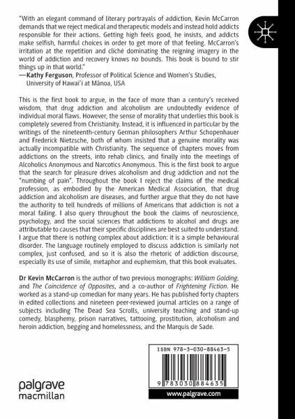 Narratives of Addiction: Savage Usury is the first book to argue, in the face of more than a century's received wisdom, that drug addiction and alcoholism are undoubtedly evidence of individual moral flaws. However, the sense of morality that underlies this book is completely severed from Christianity. Instead, it is influenced in particular by the writings of the nineteenth-century German philosophers Arthur Schopenhauer and Frederick Nietzsche, both of whom insisted that a genuine morality was actually incompatible with Christianity. The sequence of chapters moves from addictions on the streets, into rehab clinics, and finally into the meetings of Alcoholics Anonymous and Narcotics Anonymous. This is the first book to argue that the search for pleasure drives alcoholism and drug addiction and not the "numbing of pain". Throughout the book I reject the claims of the medical profession, as embodied by the American Medical Association, that drug addiction and alcoholism are diseases, and further argue that they do not have the authority to tell hundreds of millions of Americans that addiction is not a moral failing. I also query throughout the book the claims of neuroscience, psychology, and the social sciences that addictions to alcohol and drugs are attributable to causes that their specific disciplines are best suited to understand. I argue that there is nothing complex about addiction: it is a simple behavioural disorder. The language routinely employed to discuss addiction is similarly not complex, just confused, and so it is also the rhetoric of addiction discourse, especially its use of simile, metaphor and euphemism, that this book evaluates.