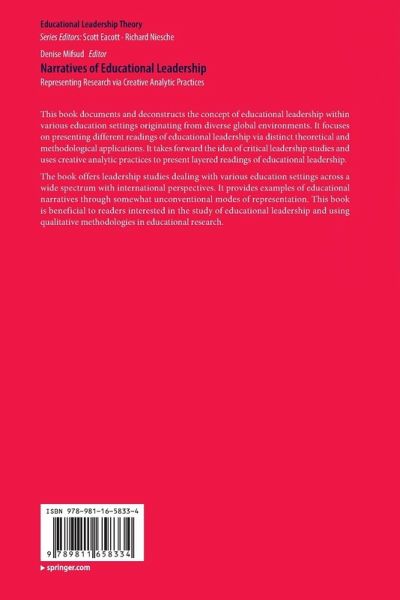 1 Introduction - Educational leadership research and creative analytic practices: A critical mapping of theoretical and methodological terrains.- 2 Educaational leadership, critique and the critical researcher.- 3 Scripting multi-academisation: Capturing contestation in educational leaders' accounts.- 4 (Mis)Leading for social (in)justice and (in)equity... (Un)following a script?.- 5 Transformative encounters: The transformative learning experience of a leader.- 6 Inclusive educational leadership for social justice and the common good.- 7 Potential theoretical approaches to support the critical exploration of 'The Problem(s)' of preparing, recruiting and retaining headteachers in Scotland.- 8 Exploring the impact of organisational governmentality on leadership episodes through narrative inquiry.- 9 The views of the few or the voices of many: Methods of exploring leadership roles through alternative approaches within higher education.- 10 Affective hauntology: What stuffed animalsand the affects they invoke may teach us about current political attempts to make girls and young women aspire to careers in STEM-fields.- 11 Conclusion: A critical commentary on the theory and methodology of educational leadership narratives.