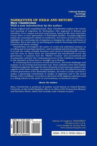 In this original and compelling book, Mary Chamberlain explores the nature and meaning of migration for Barbadians who migrated to Britain and elsewhere. It is a unique oral and social history, based on life-story interviews across three or more generations of Barbadian families. Locating migration within the contemporary debate on modernity, Narratives of Exile and Return highlights the continuing role of migration in shaping the culture and history of Barbados. But it does more by providing post-modern theorizing with concrete national and ethnic settings.