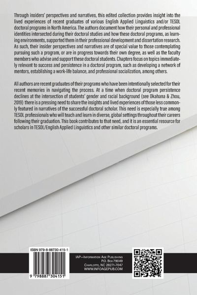 This collection provides insights into the experiences of recent graduates from English Applied Linguistics and TESOL doctoral programs in North America. It highlights the intersection of personal and professional identities, support systems, and key topics like mentorship, work-life balance, and professional socialization.