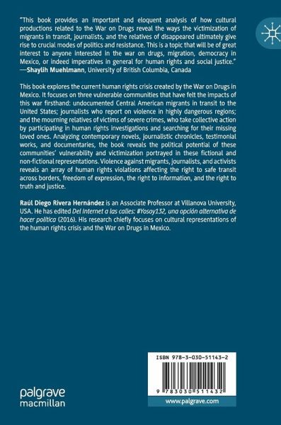 This book explores the current human rights crisis created by the War on Drugs in Mexico. It focuses on three vulnerable communities that have felt the impacts of this war firsthand: undocumented Central American migrants in transit to the United States, journalists who report on violence in highly dangerous regions, and the mourning relatives of victims of severe crimes, who take collective action by participating in human rights investigations and searching for their missing loved ones. Analyzing contemporary novels, journalistic chronicles, testimonial works, and documentaries, the book reveals the political potential of these communities' vulnerability and victimization portrayed in these fictional and non-fictional representations. Violence against migrants, journalists, and activists reveals an array of human rights violations affecting the right to safe transit across borders, freedom of expression, the right to information, and the right to truth and justice.