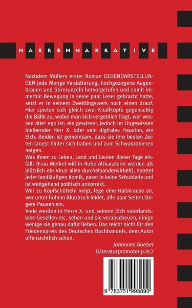 Den Hintergrund von Müllers Zweitlingswerk liefert die jüngste Vergangenheit: Frau Merkel will in Ruhe Altkanzlerin werden als plötzlich ein Virus alles durcheinanderwirbelt. Davor spielen sich zwei Knallköpfe gegenseitig die Bälle zu, wobei man sich vergeblich fragt, wer wessen alter ego ist: ein gewisser, jedoch im Ungewissen bleibender Herr X. oder sein digitales Haustier, ein Elch. Beiden ist gemeinsam, dass sie ihre besten Zeiten längst hinter sich haben und zum Schwadronieren neigen. Was sie dabei alles von sich geben, spottet jeder landläufigen Komik, passt in keine Schublade und ist weitgehend politisch unkorrekt. Wer zu Kopfschütteln neigt, lege eine Halskrause an, wer unter hohem Blutdruck leidet, alle paar Seiten längere Pausen ein. Die meisten werden in Herrn X. und seinem Elch vaterlandslose Gesellen etc. sehen und sie verabscheuen, einige wenige sie genau dafür lieben. Das reicht nicht für den Friedenspreis des Deutschen Buchhandels, dem Autor offensichtlich schon.